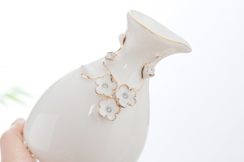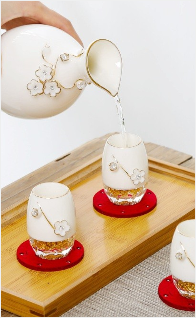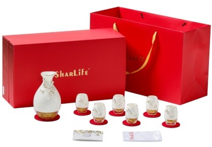 Set quà bao gồm 1 bình và 6 ly, dùng để thưởng trà, Tặng phẩm được làm từ chất liệu sứ cao cấp, điêu khắc hoa văn tinh xảo, Phần đế bình và chân ly được làm bằng chất liệu pha lê trong suốt, mạ vàng cao cấp 24k,